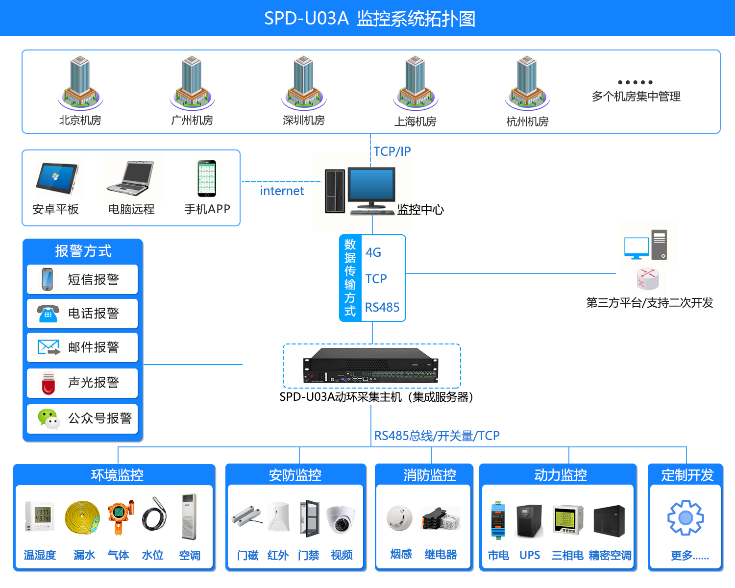 SPD-U03_1嵌入式一體化監(jiān)控主機,接口采用標準的網(wǎng)口、RS485/等標準化接口,標準行業(yè)19寸機架式安雯結(jié)構(gòu)。外接的傳感器設(shè)備的供電部分由監(jiān)控主機進行供電,無需額外供電。配合動環(huán)軟件可以實現(xiàn)配電監(jiān)控、UPS監(jiān)控,停電監(jiān)控、空調(diào)監(jiān)控、漏水監(jiān)控、視頻監(jiān)控、門禁監(jiān)控、溫濕度監(jiān)控、煙感監(jiān)控、防盜監(jiān)控等。警情發(fā)生時可實現(xiàn)聲光報警、短信報警、電話語音報警、郵件報警等報警方式。實現(xiàn)監(jiān)控報警并聯(lián)動控制功能,內(nèi)嵌WEB軟件。用戶通過IE瀏覽器查看環(huán)境、設(shè)備參數(shù)、報警、報表等信息,無人值守現(xiàn)場、倉庫等場景的動力、環(huán)境、安全及網(wǎng)絡(luò)的一體化監(jiān)控而設(shè)計。實現(xiàn)了機房設(shè)備的統(tǒng)一監(jiān)控,減輕了機房維護人員負擔,提高了系統(tǒng)的可靠性,實現(xiàn)了機房的科學(xué)管理位置確認。