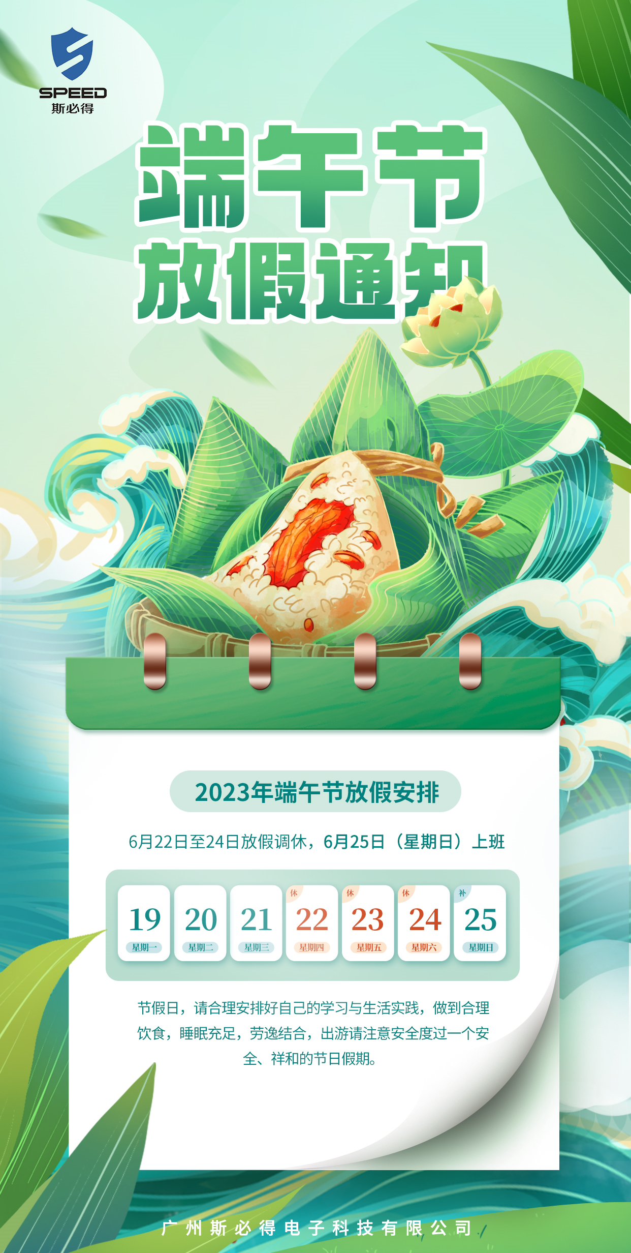端午節是我國傳統節日之一,集拜神祭祖、祈福辟邪、歡慶娛樂和飲食為一體的民俗大節,根據我國法定假期的相關規定,結合公司實際運營情況,對2023年端午節作以下調休放假安排: